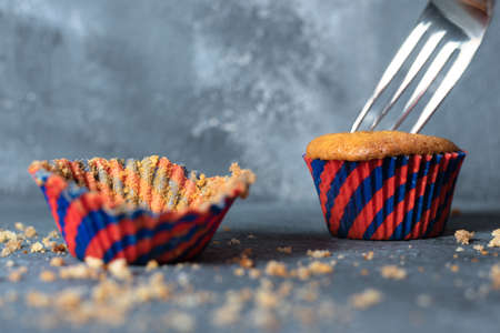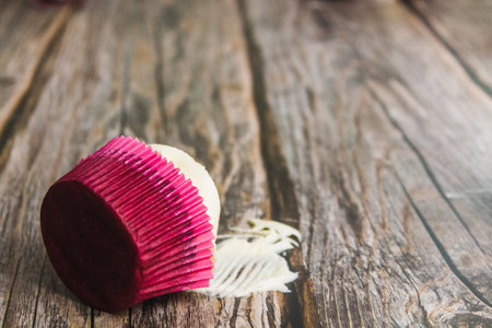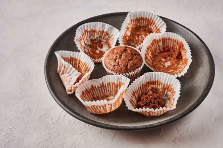 Homemade chocolate cupcake in baking paper form, next to empty wrappers on dark plate on wooden background, selective focus