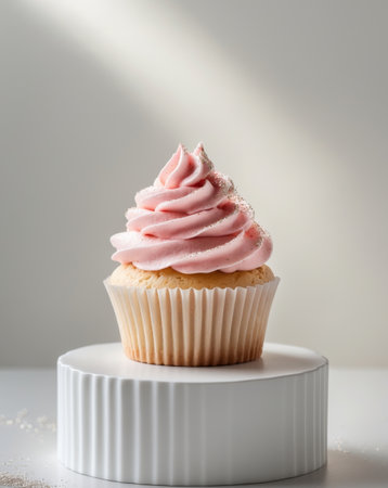 Delightful cupcake topped with pink frosting and colorful sprinkles on a soft white background