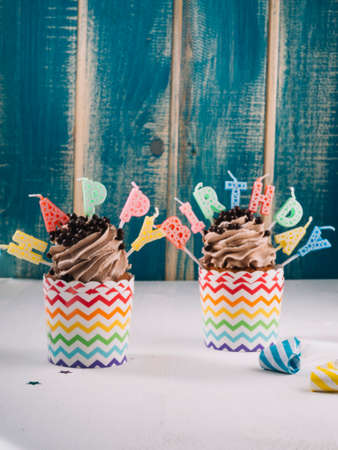 Happy Birthday day cupcake and cake bakery with candles, bright lights bokeh. Background holiday with confetti, balloon and place for text.