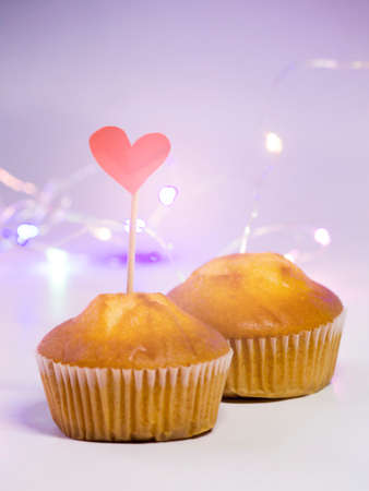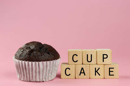 Delicious cupcake with greeting card on pink background. close up photo, holiday time, pleasant surprise