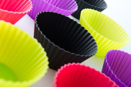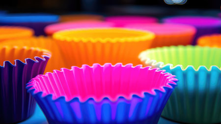 Brightly lit silicone molds with cupcake liner shapes in vivid colors