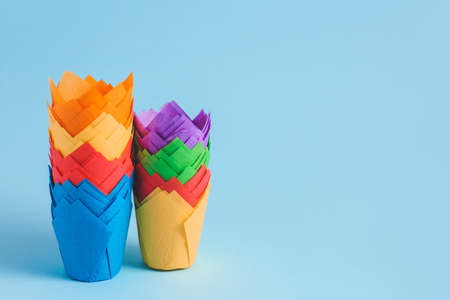 Several stacks of colorful muffin or cupcake cups on blue background
