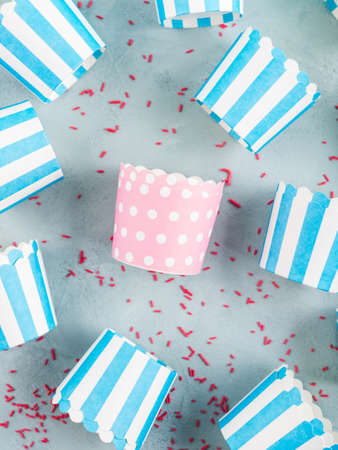Pastel blue striped paper cases for baking cup cakes with one different pink on gray background. Sweet pastry concept, flat lay.