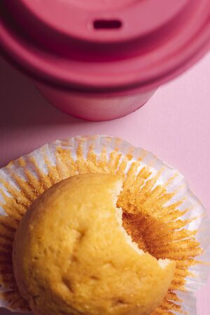 Top view of a muffin and a cup of coffee. Partially eaten muffin on a pink table. Breakfast with muffin and coffee