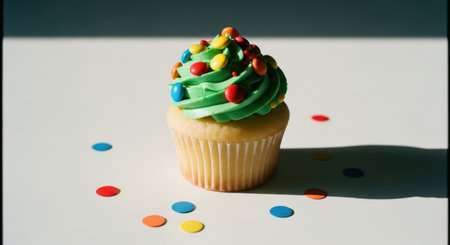 Vanilla cupcake with bright green frosting and colorful candy sprinkles on a clean white surface, surrounded by scattered confetti. perfect for celebrations.