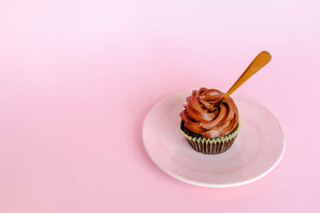 Dark chocolate cupcake and golden spoon on pink background. Sweet food concept.