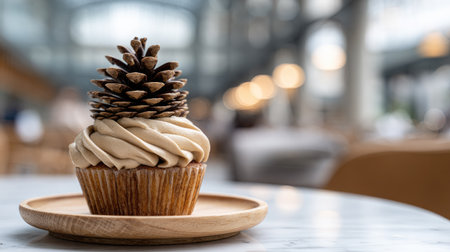 A close-up captures a cupcake featuring a swirl of light brown frosting crowned with a pinecone. The cupcake rests on a wooden plate atop a surface. The background is blurred, suggesting an indoor setting. This image is suitable for various commercial uses, including advertising and editorial content.