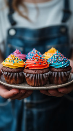 A person holds a plate with several cupcakes decorated with vibrant frosting and colorful sprinkles. The setting suggests a fun baking session, featuring a casual outfit.