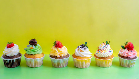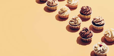 Delicious muffins composition in two rows on yellow background. Sweet pastry