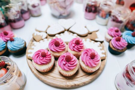 Cakes with raspberries and strawberry jam. Dessert table for a wedding party.