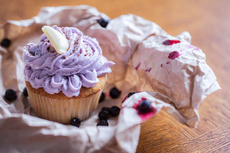 Cupcakes with berry cream on a wooden table. Selective focus. Dessert with fresh cherry berries.