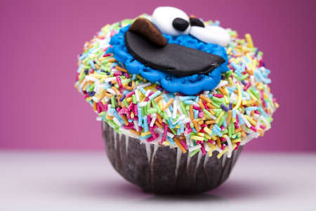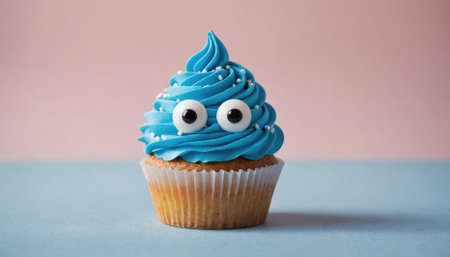 Cute and funny cupcake for kids on blue background with copy space. Happy Birthday dessert. Childrens party. Empty space for text. Postcard, greeting card design. Monster muffin. Generative AI.