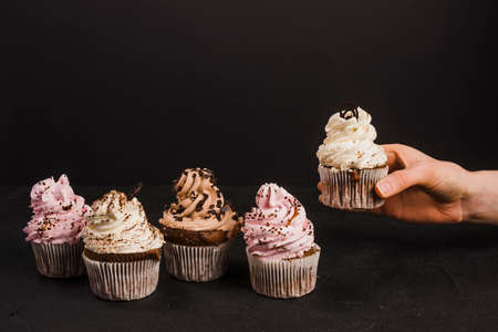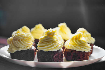 Chocolate cupcakes with yellow butter cream, homemade, on a plate in hands