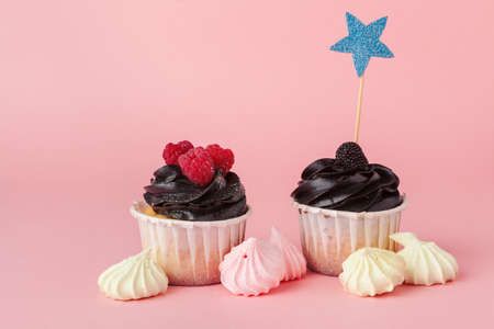 Boy and girl birthday. Two cupcakes vanilla and chocolate with candles on pink pastel background, copy space.