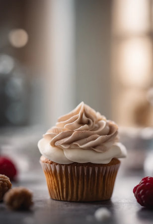 Cupcake with whipped cream and fresh raspberries, selective focus