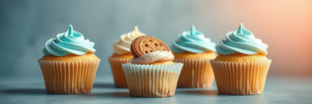 Delicious cupcakes with blue frosting and cookies arranged on a gray surface