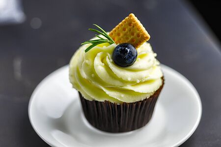 one cupcake with cookies, rosemary, blueberries on a white saucer, on a dark background.