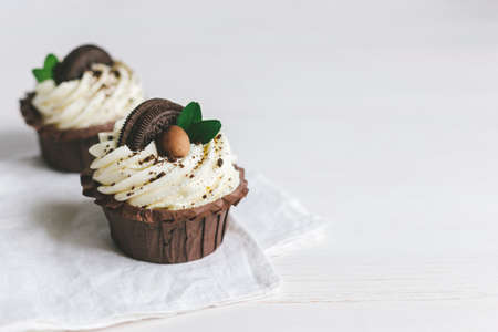 Delicious homemade cupcakes with Colorful cream and topping with candy and Chocolate Cookies. Homemade autumn holiday dessert