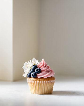 AI Generated. Pink Frosting Cupcake with Blueberries and Flowers