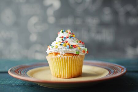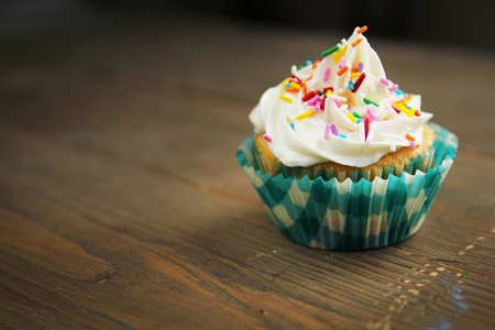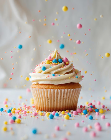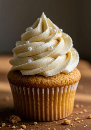 Vanilla cupcake with cream frosting and sprinkles on a wooden surface, a sweet dessert treat for celebration.