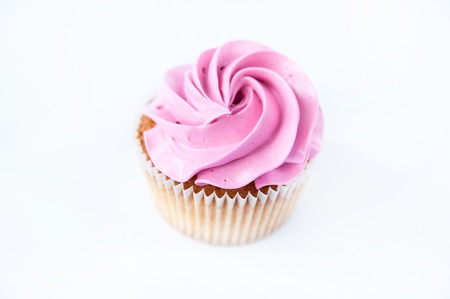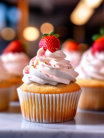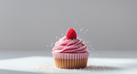 AI Generated. Pink Frosted Cupcake with Raspberry and Pearl Sprinkles on White Surface