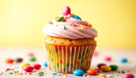 Close-up of a delicious birthday cupcake topped with sprinkles, sitting on a bright yellow backdrop, perfect for parties.