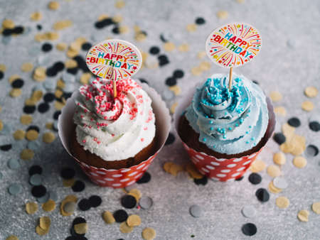 Happy Birthday day cupcake and cake bakery with candles, bright lights bokeh. Background holiday with confetti, balloon and place for text.