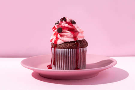 AI Generated. Delicious Pink Frosted Chocolate Cupcake with Sprinkles
