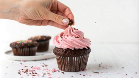 Cupcake decorating with sprinkles. Use for baking blogs, dessert recipes, party themes, food photography, sweet treats, celebration ideas.