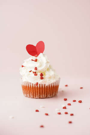 One homemade chocolate muffin with white creamy frosting and heart-shared red and white sugar decoration on marble board on pink surface