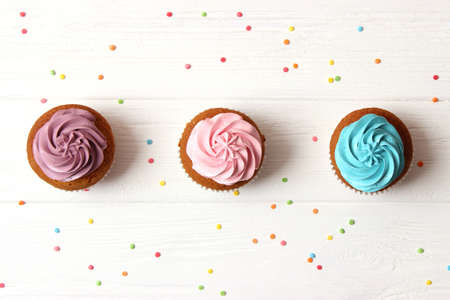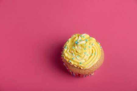 Tasty muffin decorated with whipped cream and colorful sprinkles