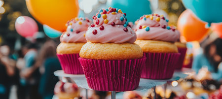 Delicious Cupcakes with Pink Frosting and Sprinkles at a Birthday Celebration with Balloons