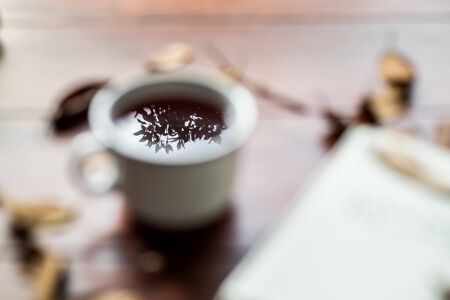 Top view of cup of hot tea in lovers hands against the background of a snow