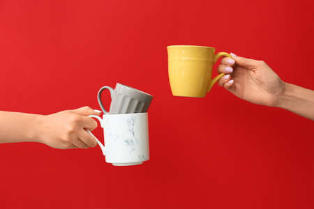 Different hands holding cups of different types of coffee on a dark background. Copy space. Meeting friends concept.