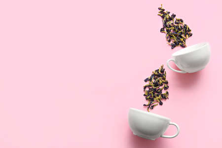 Creative composition with cups and dried butterfly pea flower tea on color background