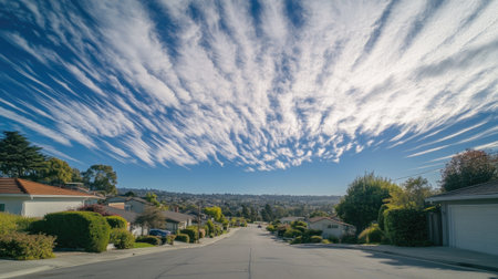 A quiet residential street with rows of homes and a vast, open sky. Copy space available above