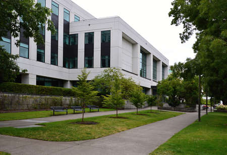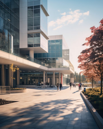 A contemporary university building with an urban design, surrounded by lush greenery and walkways. Students are seen walking between classes on a cloudy day, enjoying the campus atmosphere.