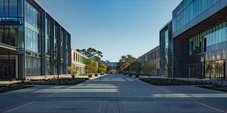 Business complex showcases glass and steel design. It stands under an open pastel sky, emphasizing the minimalist architecture and structure.