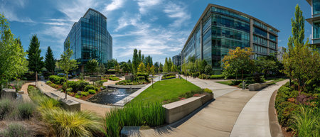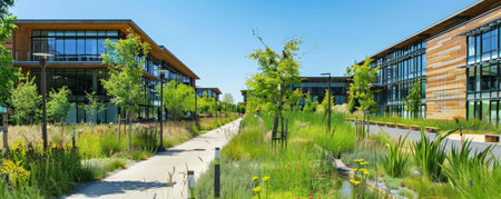 This image showcases a serene cityscape with contemporary buildings along a waterway. The scene includes a bridge, trees, and other greenery. The composition is balanced and well-lit with natural sunlight, suitable for a variety of commercial and editorial purposes.