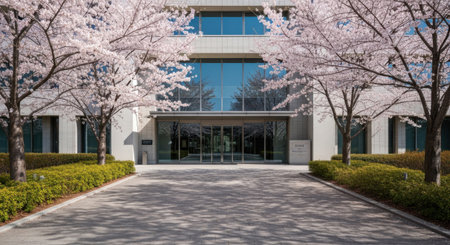 A pathway leads to a contemporary building entrance framed by delicate pink cherry blossoms.