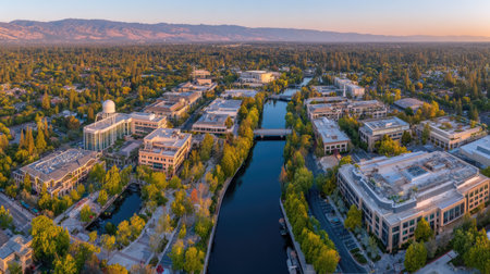 An aerial photograph showcases multiple buildings and a river winding through a densely treed area. The composition features various structures in a modern style under warm lighting. The image suggests a peaceful, natural environment, potentially suitable for commercial and editorial applications.