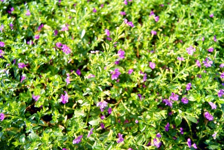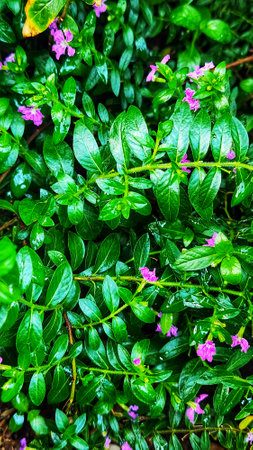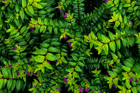 Dense green foliage with small vibrant purple flowers, captured in natural daylight. Perfect for use as a botanical background or eco-friendly nature-themed design.