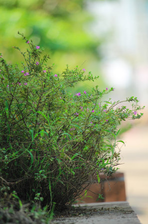 Selected Focus of Green Bush with some little purple flowers in the garden under bright sun