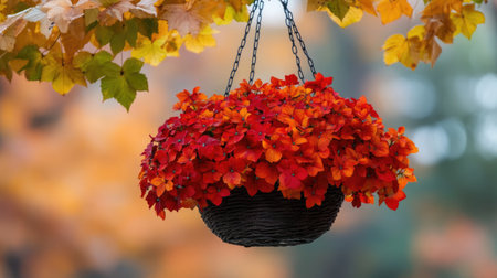 A stunning hanging flower basket filled with vibrant red and orange blooms against a backdrop of colorful autumn leaves, capturing the beauty of the season.