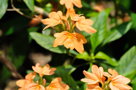 Beautiful peach Firecracker Flowers (Crossandra infundibuliformis) captured in a close-up, highlighting their intricate petal structure and warm hues