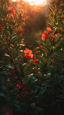 The Cuphea at sunset, Golden red sunset light filters through the leaves, still atmosphere, warm orange glow blending with natural green tones.
