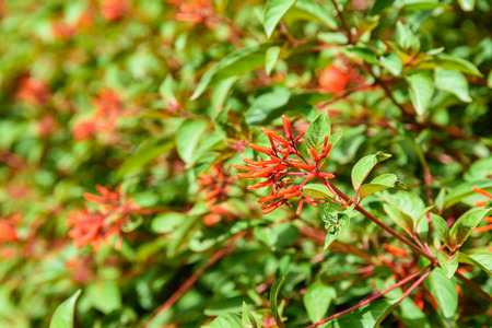 Hummingbird bush, Scarlet bush, Hamelia patens, evergreen shrub with orange-red tubular flowers in corymbose panicles.