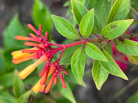 Vibrant exotic tropical bloom of Cuphea Hummingbird's Lunch Cigar Plant, red and yellow tubular flowers with green foliage in the summer garden.