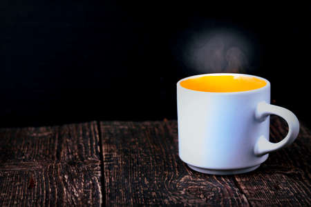 White mug with steaming coffee on an old textured wood surface. Vintage background