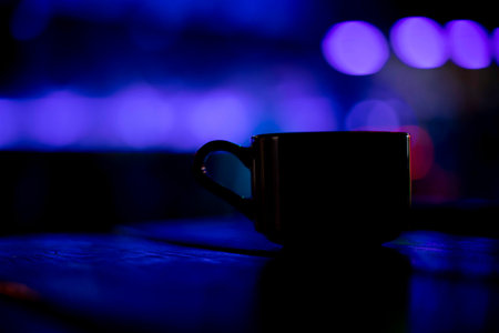 Freshly brewed cappuccino in a cup of white color on a wooden table in trendy neon light.